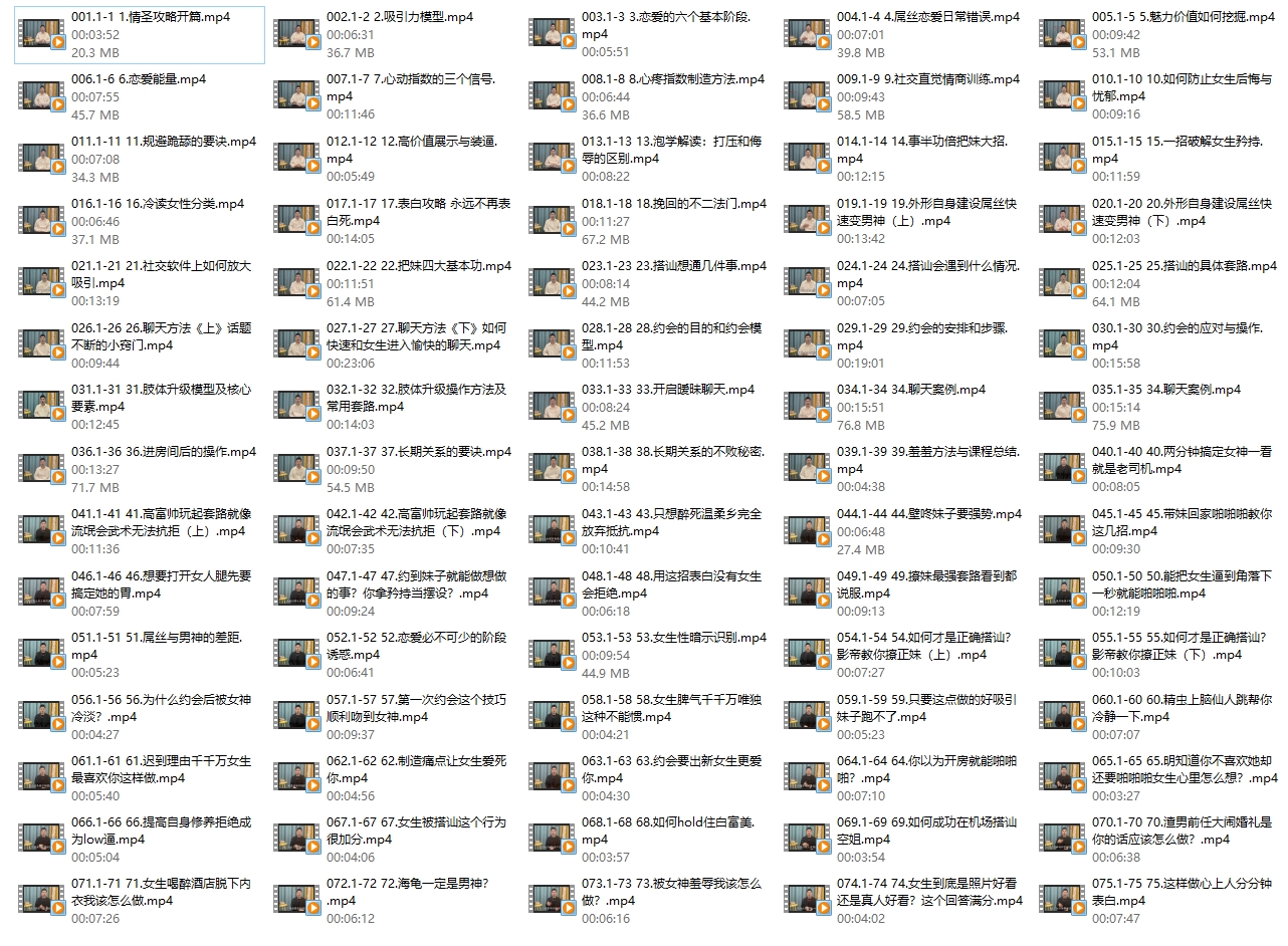 课程分为形象改造心态建设 收集资源 聊天技巧 约会模型 短期关系 长期相处 让你成为真正的情感王者。