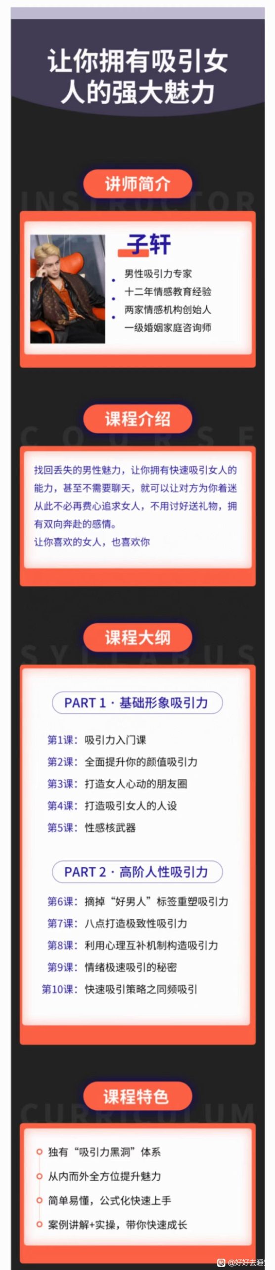 恭喜你,从这一刻起,你将正式进入吸引力的大门。不论你现在的感情状况有多么糟糕,这套吸引力黑洞体系都能让你拥有吸引力,拥有让女人为你而来的强大魔力。讲师紫萱,从2010年就开始从事情感行业,同时也是两家情感公司的创始人。我从不追求女生,却可以拥有三位数的情感关系。和我恋爱的女生有演员,有网红,有职业经理人,甚至还有身价是我几十上百倍的白富美来倒追我。那我是怎么做到不去追求,反而能让女人为我而来呢?因为我拥有一套吸引力的黑洞体系,从女人被我吸引的那一刻起,她就无法逃离。吸引是一切恋爱关系的原点,不具备吸引,你就会掉进供养者的陷阱里,只能按照社会的既定规则去追求,去讨好,去乞求女人的施舍,就算费尽心力追到了,就算你物质条件优越,也很难逃脱出供养者的宿命,到最后失去价值被抛弃。毫不夸张的说,99%的男人都不具备吸引力,而你跟随我,可以成为那1%极具吸引力和魅力的男人。这套课程会从基础的形象吸引力到高阶的人性吸引力,层层递进,抽丝剥茧,让你跟随吸引力的黑洞体系,一步步完成逆袭,完成蜕变。如果你想要的是短期关系,想吸引社会阶层低于你的美女,基础篇请认真学习两遍以上,如果你想吸引和你同阶层甚至比你社会阶层更高的白富美,高阶篇,请认真学习三遍以上。每一次的领悟和实操都会内化成你自己的吸引力场。数千学员都是这套吸引力黑洞体系的受益者,他们获得了真爱,甚至连命运也有了巨大的改变。从这一刻,跟随我,开启你的吸引力。
