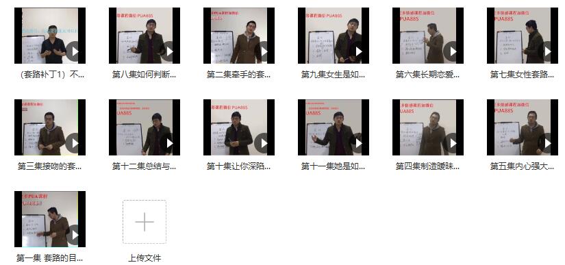 │ 第一集 套路的目的.mp4│ 第二集牵手的套路.mp4│ 第三集接吻的套路.mp4│ 第四集制造暧昧聊天的套路.mp4│ 第五集内心强大的套路.mp4│ 第六集长期恋爱关系中的套路.mp4│ 第七集女性套路介绍.mp4│ 第八集如何判断他的套路与真心.mp4│ 第九集女生是如何让你心态崩盘的.mp4│ 第十集让你深陷其中的套路.mp4│ 第十一集她是如何控制你的.mp4│ 第十二集总结与应对套路的核心.mp4│└─学习课程前-注意事项
